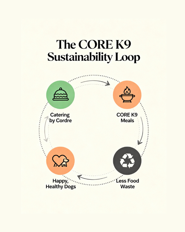 Powered by Catering by Cordre, we turn surplus chef-prepared ingredients into fresh, balanced meals for your dog—better nutrition, less waste.