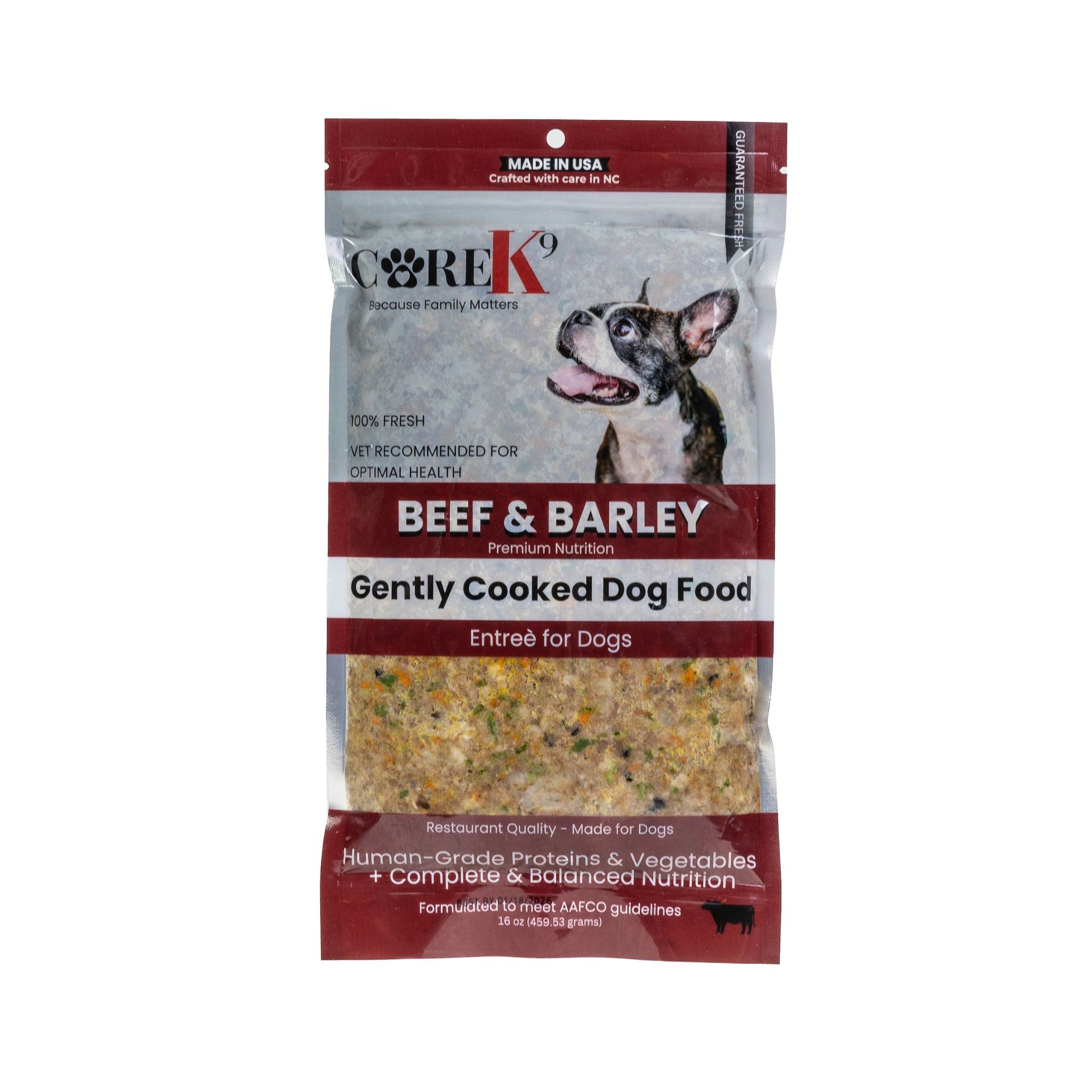 CORE K-9 Beef and Barley EntrΓ©e for Dogs is formulated to meet the AAFCO Dog Food Nutrient Profiles for Adult Maintenance