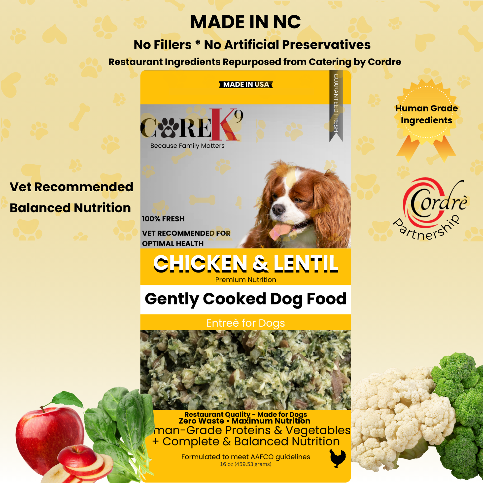 CORE K9 Chicken and Lentil EntrΓ©e for Dogs is formulated to meet the AAFCO Dog Food Nutrient Profiles for Adult Maintenance. Visit your veterinarian regularly to maintain your pets health. Always provide fresh water.Β