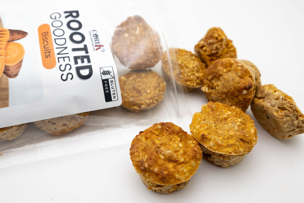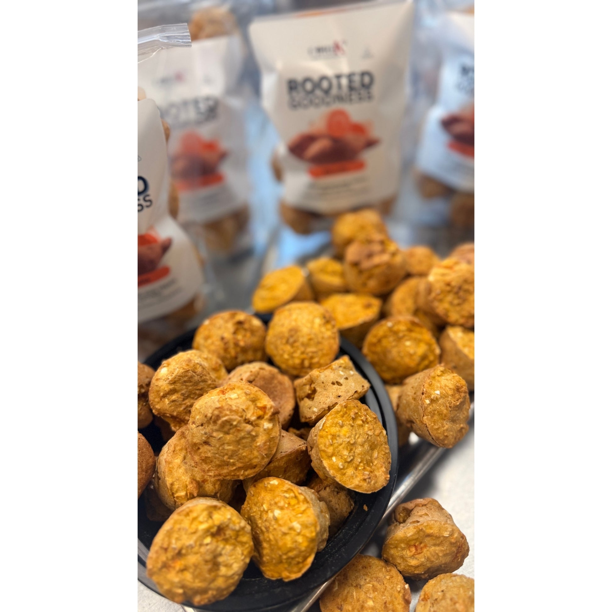 Give your dog a snack thatβs both delicious and nutritious with Rooted Goodness Dog Biscuits by CORE K9! Crafted with real sweet potatoes, whole eggs, molasses, and gluten-free flour, these biscuits deliver a satisfying crunch packed with natural goodness.