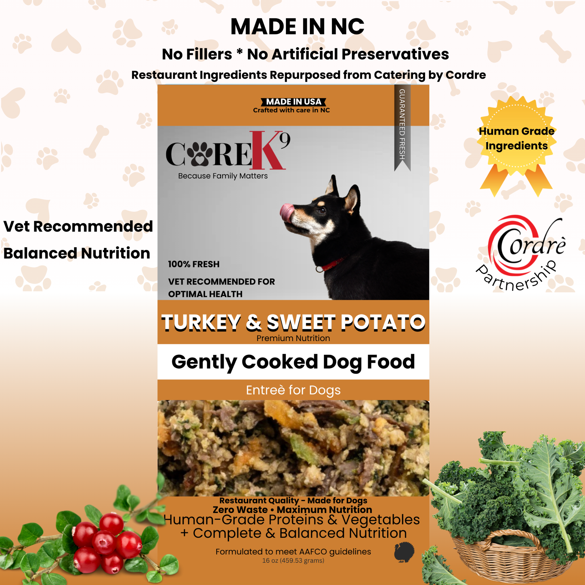 CORE K9 Turkey and Sweet Potato Entrée for Dogs is formulated to meet the AAFCO Dog Food Nutrient Profiles for Adult Maintenance. Visit your veterinarian regularly to maintain your pets health. Always provide fresh water.